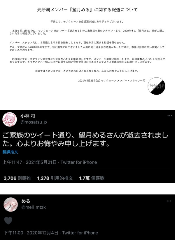 随后,专门挖掘女模的“Miss iD”编辑小林司发文追悼,并向媒体证实死讯,外界才得知家属账号发文并不是假消息。而望月Meru生前曾隶属的地下偶像女团“Monoclone”也发声明,坦诚是看到报道才知情:“这是令人非常痛苦的事实。”