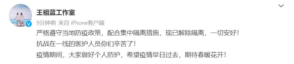 【1035 更新】王祖蓝工作室发文称,王祖蓝已经完成了隔离,一切安好。