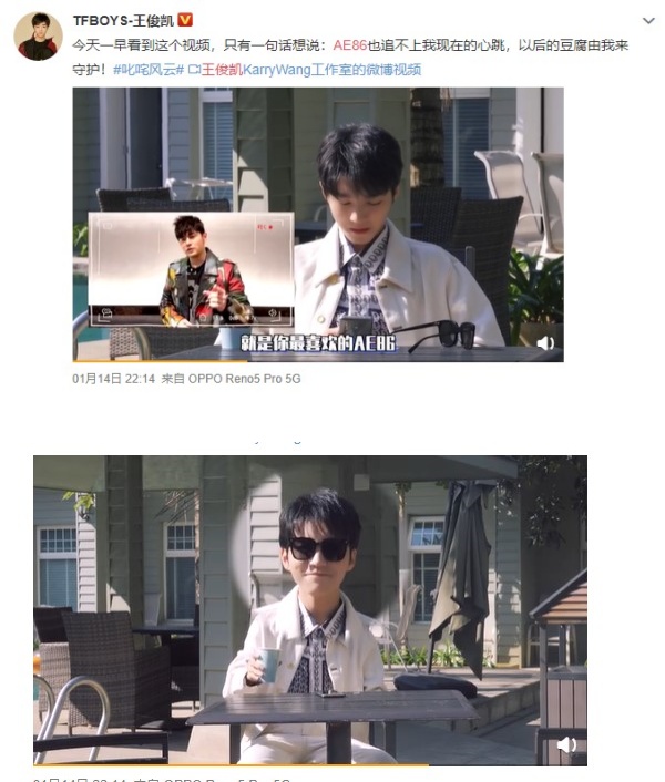 TFBOYS成员王俊凯是天王周杰伦的迷弟,早前他受邀客串演出周杰伦的新戏《叱咤风云》,近日他更获得周杰伦豪送一台AE86。