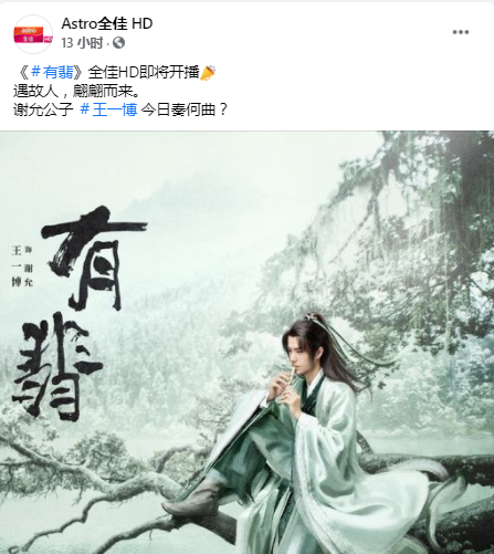 Astro全佳昨天(11日)在FB发文,预告“《#有翡》全佳HD即将开播”,并晒出王一博的海报,写道:“遇故人,翩翩而来。谢允公子 #王一博 今日奏何曲?”