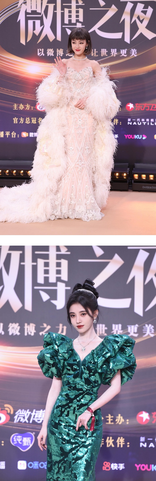 其中,迪丽热巴以复古齐刘海短发造型现身、搭配羽毛披风,尽显富贵、魅惑气质。另外,鞠婧祎以一袭墨绿珠光鱼尾裙亮相,超细蚂蚁腰让网友惊呼:“这腰是真实存在的吗?”