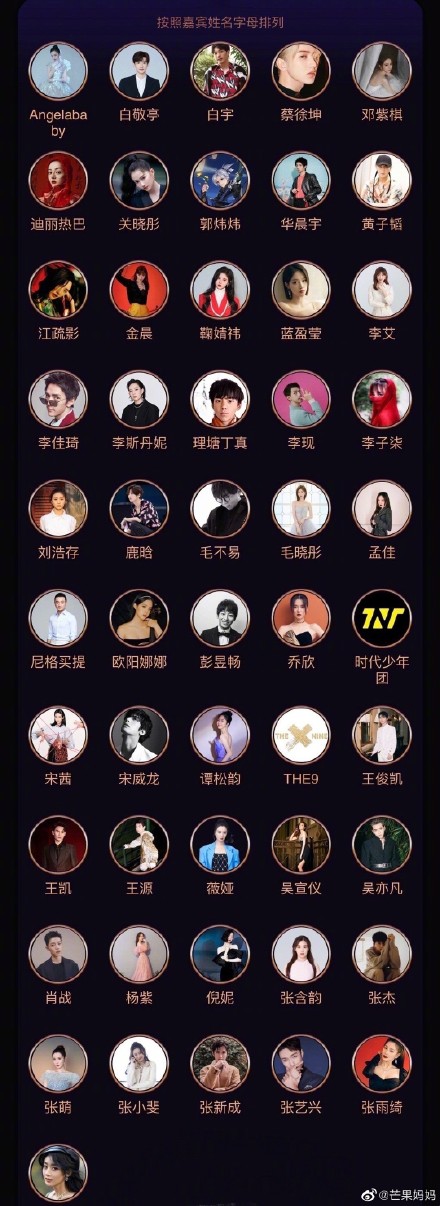 将在28日举办的“微博之夜”目前已官宣了5波阵容,包括Angelababy、白宇、蔡徐坤、华晨宇、李现、时代少年团、宋茜、THE9、王源、吴亦凡、杨紫、赵丽颖、张艺兴、鞠婧祎、李斯丹妮、刘浩存、孟佳、谭松韵、张新成、白敬亭、关晓彤、江疏影、金晨、毛晓彤、欧阳娜娜、彭昱畅、宋威龙、王凯、吴宣仪、张小斐、邓紫棋、迪丽热巴、黄子韬、鹿晗、毛不易、倪妮、王俊凯、肖战、张杰、张雨绮、邓超、贾玲、郎朗 、李冰冰 、李宇春、刘嘉玲、秦昊、孙俪、沈腾、佟丽娅、唐嫣、童瑶、王一博、杨幂、周冬雨、丁真等。