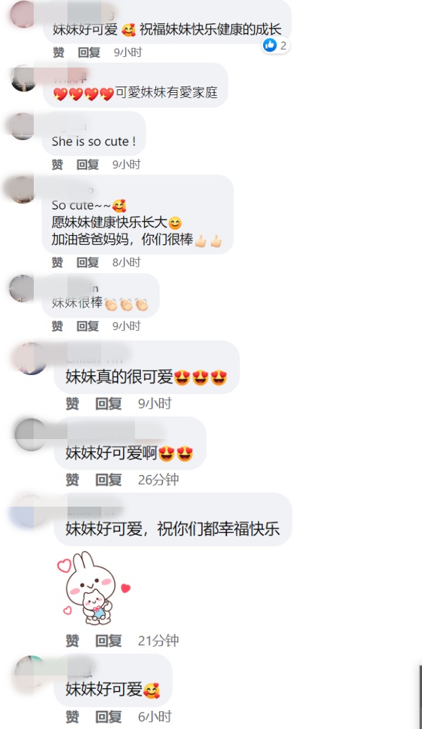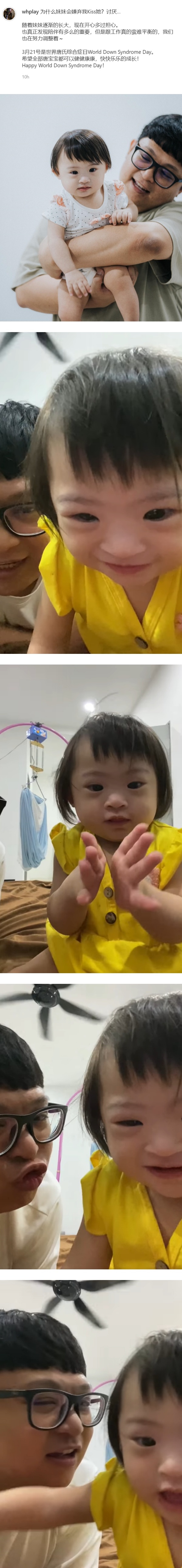 文末,伟鸿提到3月21日是世界唐氏综合症日,“希望全部唐宝宝都可以健健康康,快快乐乐的成长!”;网友看了伟鸿和忆菡的互动视频后留言,“祝福妹妹快乐健康的成长”、“可爱妹妹有爱家庭”、“妹妹好可爱,祝你们都幸福快乐”、“妹妹很棒”等。
