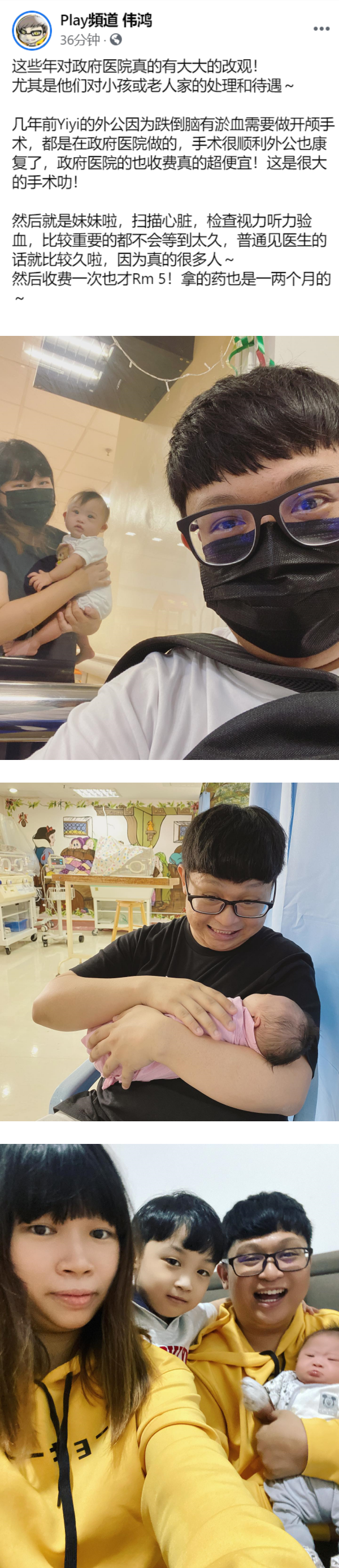 伟鸿提到,几年前因为太太Yiyi的外公跌倒到政府医院进行脑部清除淤血的手术,一切顺利的同时,收费也超便宜。另外他提到,妹妹出生后得到政府医院进行心脏扫描、检查视力、听力、验血等多项检测,全部的收费也才RM5。