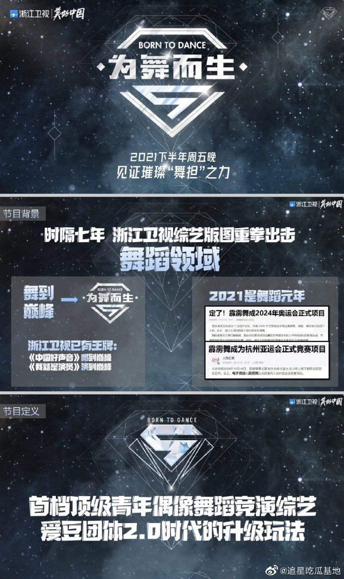浙江卫视近日宣布将推出新综艺《为舞而生》,号称是“爱豆团体2.0时代的升级玩法”,预计将在今年第三、四季度开播。每期将有5位舞担一起挑战同一主题,编创真人秀呈现竞演舞台!