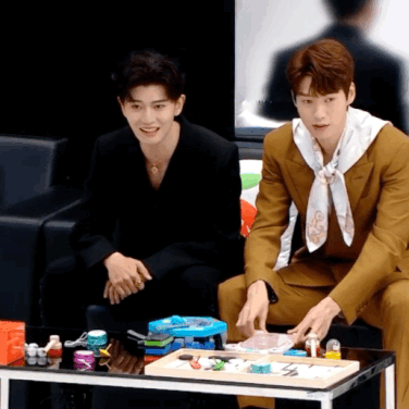 魏大勋、黄明昊穿着西装,竟在后台玩着摇摇球,画面看起来非常搞笑。