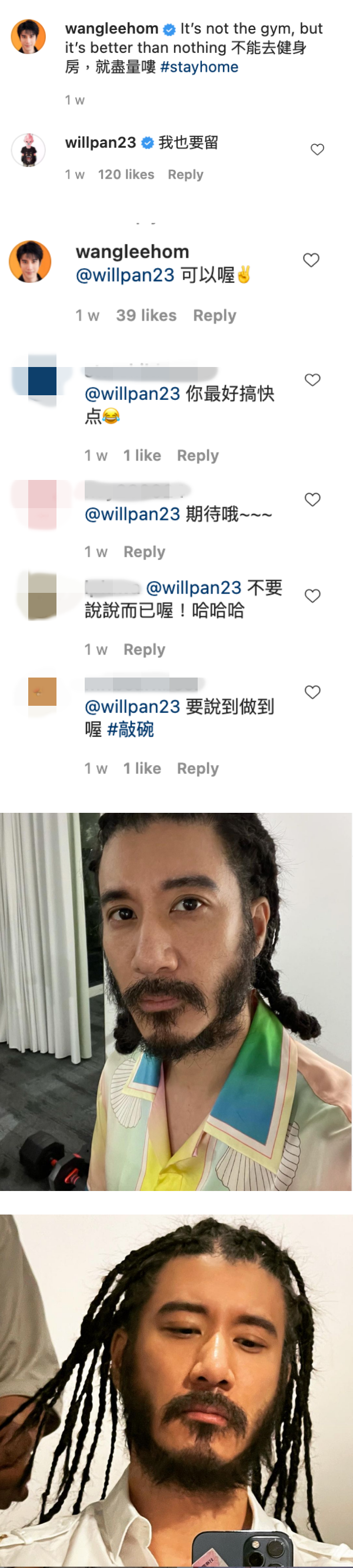 2日,潘玮柏在在见到王力宏的新造型后,曾到照片底下留言:“我也要留” ,获得王力宏回复:“可以哦”,众多粉丝更是调侃潘玮柏:“不要说说而已哦”、“记得发文给我们看” ,希望他真的跟着王力宏一起蓄胡。