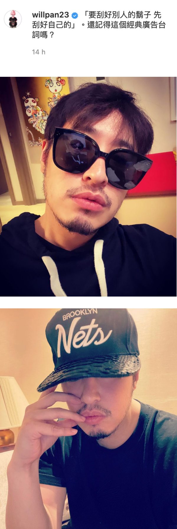 12日晚,潘玮柏依约晒出自己的近照,照片可见他身穿黑衣戴着墨镜,骄傲的露出了多日的“蓄胡成果” ,并幽默的写道:“要刮好别人的胡子,先刮好自己的 ,记得这个经典广告台词吗?”