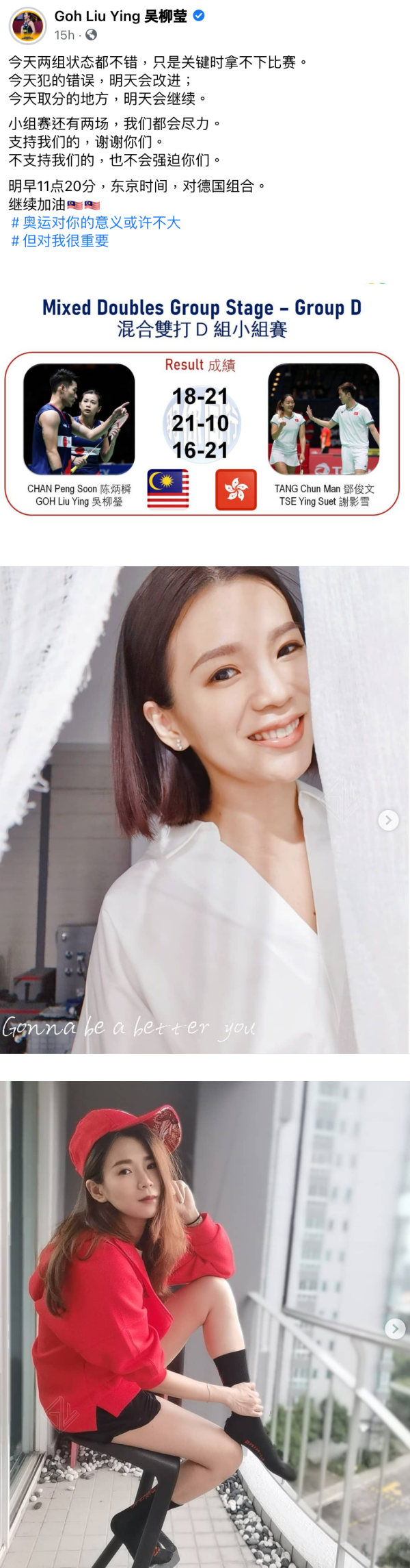备受期望的大马混双组合吴柳莹和陈炳橓在第一场小组赛中以18-21、21-10、16-21 的比分败给了香港组合邓俊文和谢影雪。对此,吴柳莹于赛后在脸书更新现况,指出今天两队的状态都不错,只是在关键时刻拿不下比赛。她也承诺:“今天犯的错误,明天会改进;今天取分的地方,明天会继续。”,也表示自己和搭档陈炳橓都会在接下来的比赛中尽力。