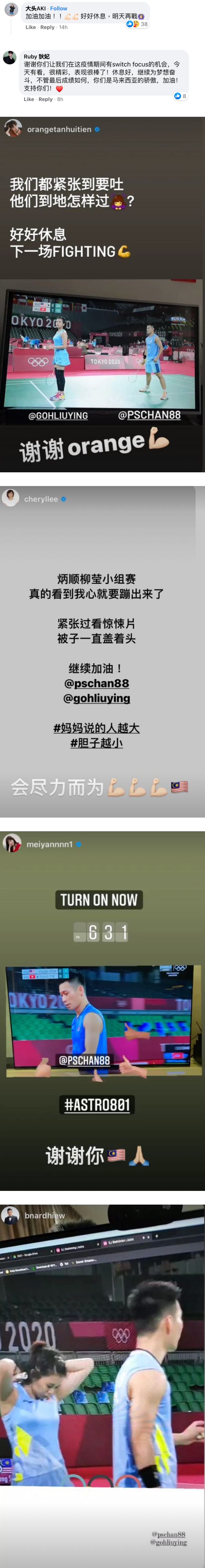 她也提到:“支持我们的,谢谢你们。不支持我们的,也不会强迫你们”,更对球迷们喊话:“奥运对你的意义或许不大,但对我很重要”。多名本地艺人如大头Aki 、狄妃、颜薇恩、陈慧恬、李欣怡和Bernard 邱文博都在留言区和Instagram 鼓励两人,要他们继续前进。
