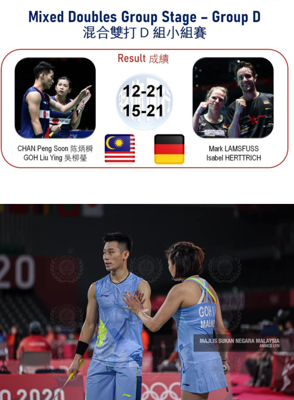 吴柳莹和陈炳橓在今天(25日)早上刚结束的第二场小组赛中再度以12-21 、15-21的比分直落两局不敌德国选手Mark Lamsfuss和Isabel Herttich 组合,晋级机会渺茫。