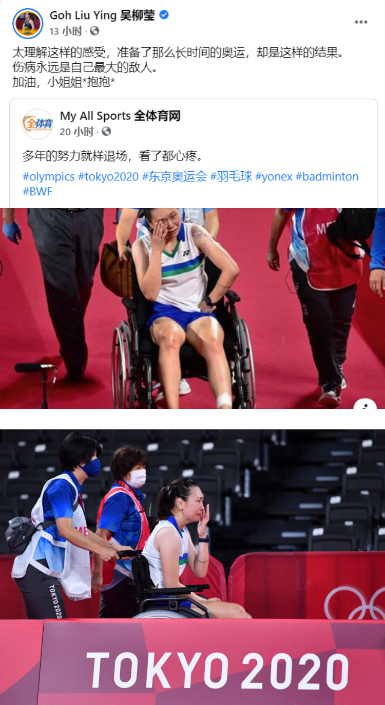 张蓓雯遗憾退赛的消息传开后,吴柳莹昨晚(29日)在FB转发新闻,感同身受地写道:“太理解这样的感受,准备了那么长时间的奥运,却是这样的结果。伤病永远是自己最大的敌人。加油,小姐姐*抱抱*。”