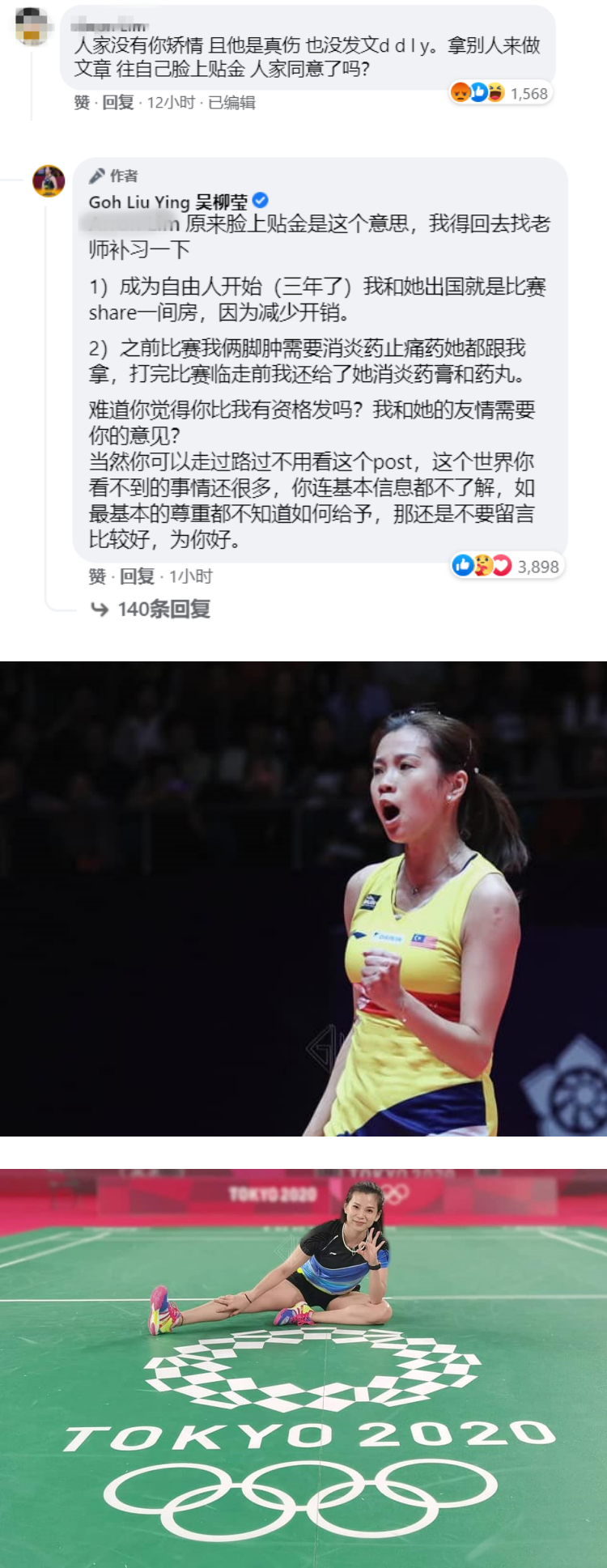 吴柳莹其后亲自回应网友的吐槽:“原来脸上贴金是这个意思,我得回去找老师补习一下”,并透露自从3年前成为自由人开始,她每次出国比赛都会与张蓓雯同住一间房,也会共享药膏。