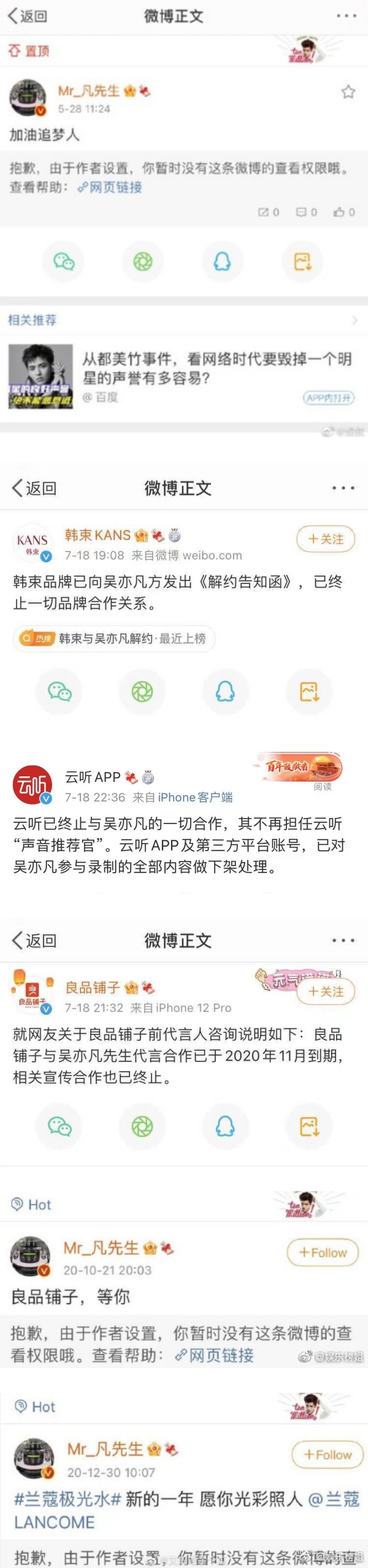 除了央视之外,吴亦凡代言的化妆品“韩束KANS” 首先发表了正式声明表示终止合作关系,而良品铺子、兰蔻、康师傅、立白、云听APP等合作多年的牌子也默默的把相关宣传帖文移除和隐藏,迅速切割吴亦凡!