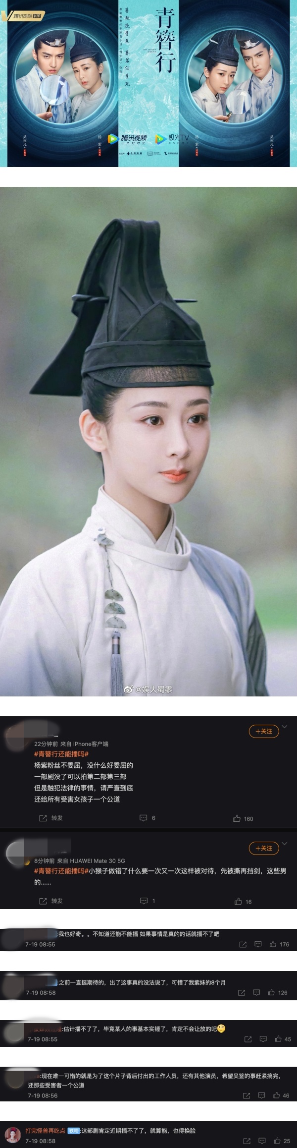 原本让观众们备受期待的《青簪行》如今传出将无限期延档,让网友们纷纷为杨紫和剧组抱屈:“如果是真的话估计不能播了吧”、“可惜了紫妹的8个月”、“这部剧肯定近期播不了了,就算能,也得换脸”、“现在唯一可惜的就是为了这个片子背后付出的工作人员,还有其他演员”、“小猴子到底做错了什么” 等。