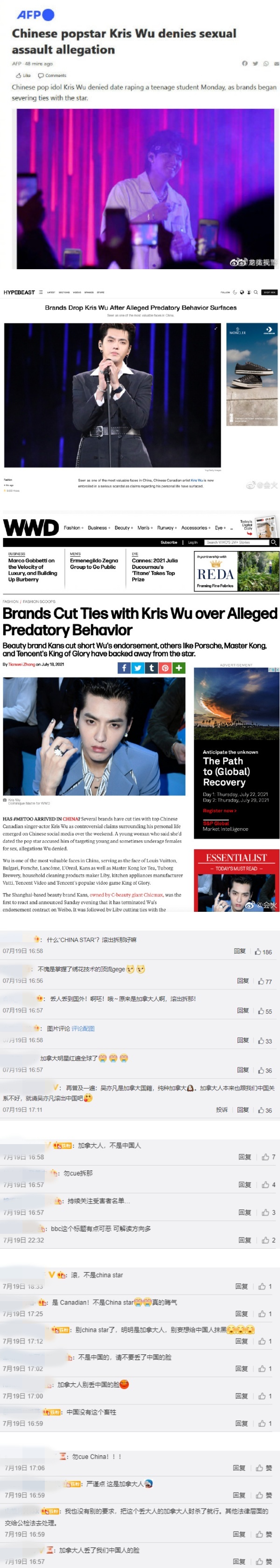 19日,《BBC》报道了一篇题为“Kris Wu:Brands drop Chinese star over teen sex allegations(吴亦凡:品牌因青少年性行为指控而放弃中国明星)”的新闻。部分网友对标题中写的“Chinese star”感到不满,表示吴亦凡的国籍为加拿大,要求纠正。