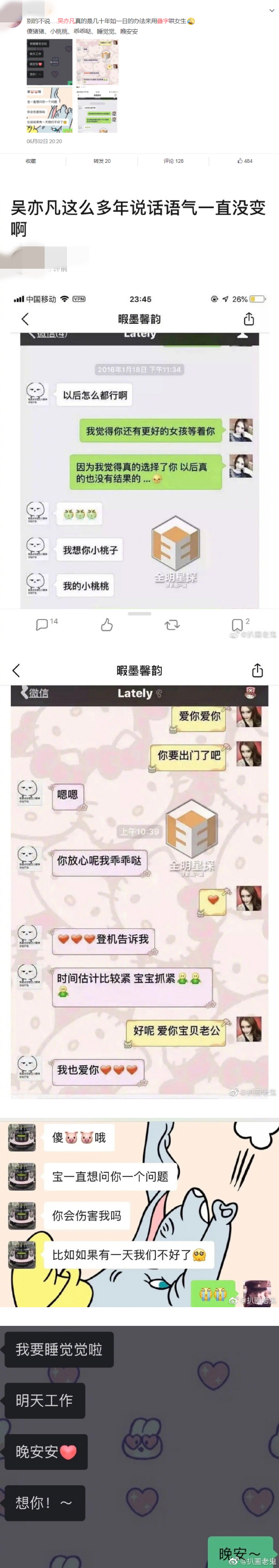 接着是2日爆出和象韵洁交往时期的聊天记录,他称对方为“小猪猪”;其他聊天记录中也爱用波浪符号和叠字如:睡觉觉、晚安安。