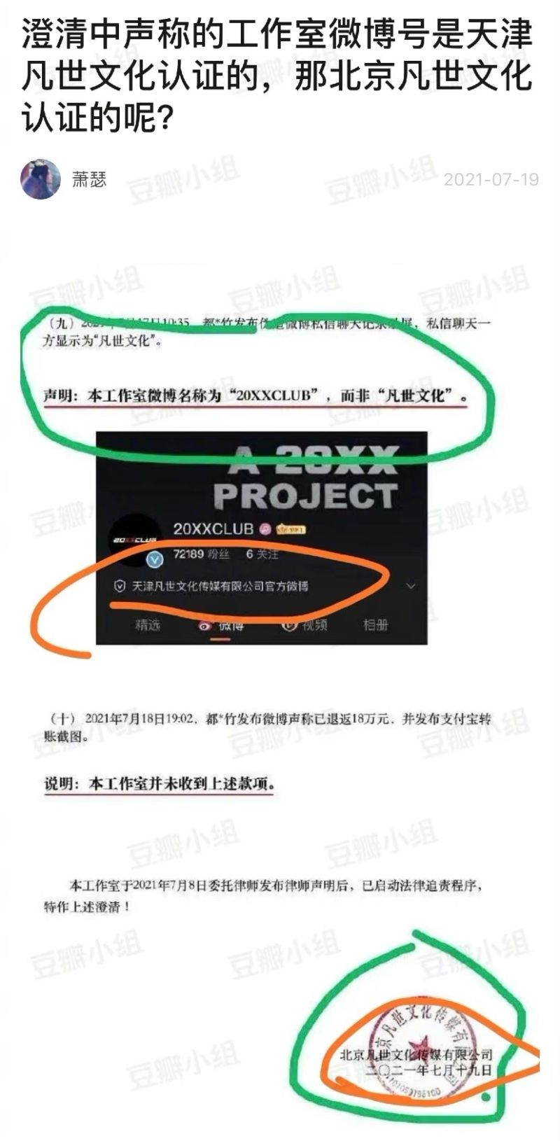 2.工作室强调,公司名称在微博上不叫“凡世文化”,而是“20XXCLUB”,让网友傻眼质问:“一个是微博名称,一个是微信名,有什么可辟谣的?”另外,网友重翻都美竹的截图,发现全程都没有拍到ID。