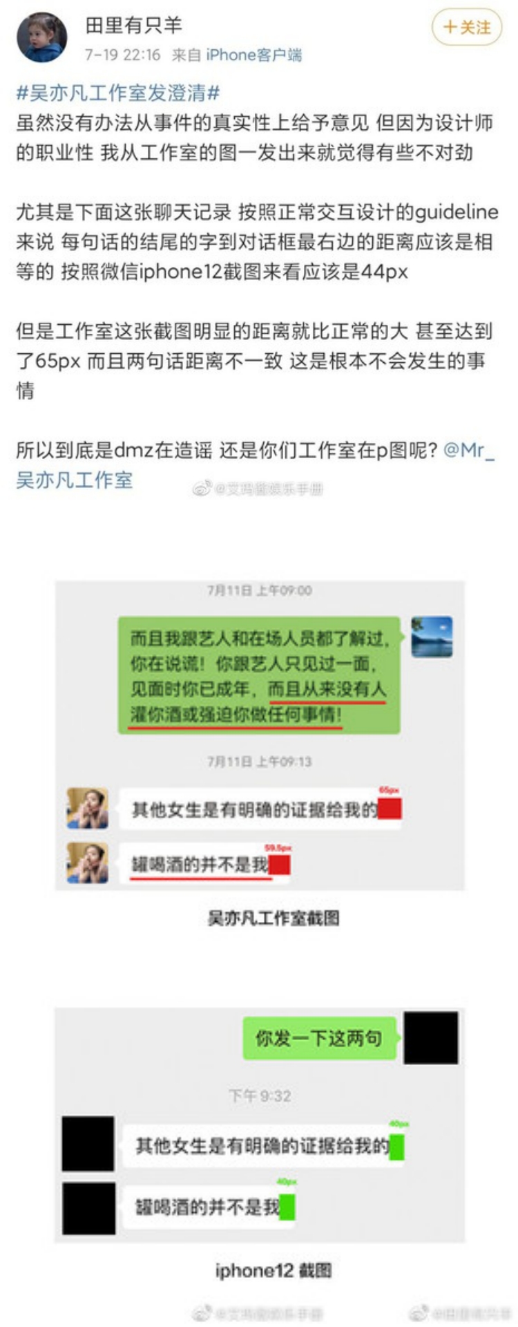 5.自称从事设计的网友发现,若按照正常交互设计的guideline(准则),微信对话中信息结尾的字到对话框最右边的距离应该要相等,但工作室提供的截图中,都美竹发出的信息结尾到对话框最右边的距离明显比正常来的大,且2句话的距离还不一致,甚至截图像素值也较一般iPhone的像素值还大,质疑:“所以到底是都美竹造谣?还是你们工作室在P图呢?”