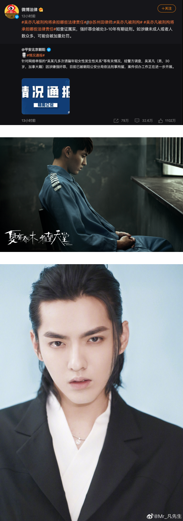 吴亦凡被网红都美竹爆料以“酒桌选妃”的方式迷奸和诱奸未成年少女,案情纠纷越滚越大,在上周进入调查程序后,北京朝阳警方终于在31日晚间发表以涉嫌强奸罪的名义刑事拘留吴亦凡,再度掀起热议。