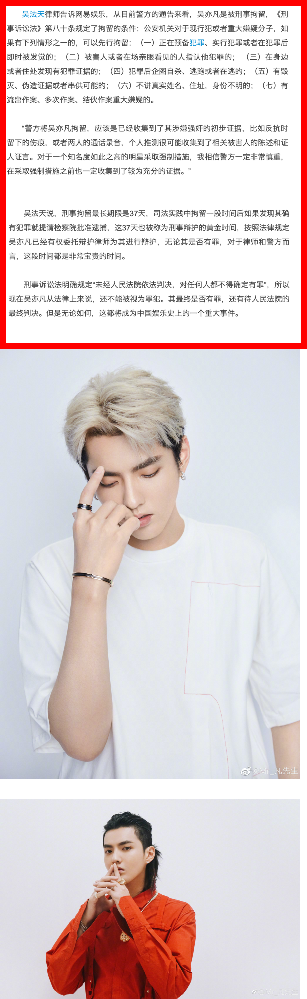 据《网易娱乐》报道,一名律师表示:“警方将吴亦凡扣留证明了已经收到其涉嫌强奸的初步证据,比如反抗时留下的伤痕,或者两人的通话录音。“他也推测了警方应该是收集到了相关被害人的陈述和证人证言才会迅速做出行动。该律师最后也认为:“无论如何,这将会是中国娱乐史上的一个重大事件”。