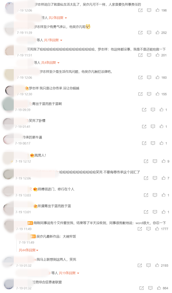 巧的是相隔一年多,此次轮到吴亦凡爆出诱骗、选妃、迷奸等连串负面新闻,有网友翻出过去吴亦凡和罗志祥的合照笑说,“吴亦凡罗志祥世纪合照”、“吴亦凡罗志祥同框照这叫什么,渣渣辉联盟”、“我马上联想到这两人,笑死”、“青出于蓝而胜于蓝啊”、“罗志祥至少有勇气承认,他吴亦凡呢”等。