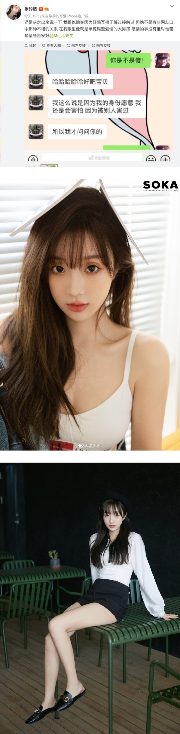 稍后,网上再传出网红象韵洁出面称,她和吴亦凡的感情状况,文中象韵洁写下,“我跟他确实因为好感互相了解接触过,但绝不是有些网友口中那种不堪的关系”,象韵洁不忘护着吴亦凡称,感情这种事没有谁对谁错,希望各自安好。