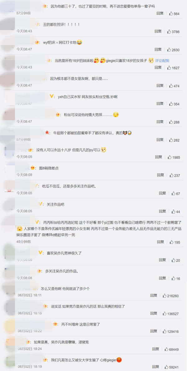 一个晚上下来,吴亦凡先后被曝和网美“小怡同学”约看电影、冷对待都美竹以及曾和网红象韵洁互相了解的绯闻,微博上甚至出现“吴亦凡有几个女朋友”的热搜词,网友留言写下,“因为他都三十了,也过了爱豆的时期,再不谈恋爱要他单身一辈子吗”、“没有人可以永远十八岁 但是凡凡的py可以”、“ 吃瓜不信瓜,还是多多关注作品吧”、“怎么又是他啊 他到底谈了多少个”等。