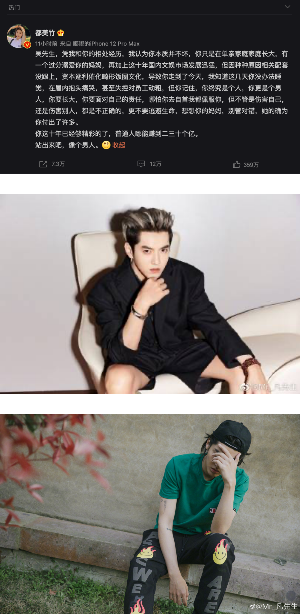 都美竹18日晚上除了发出了2000字的长文宣战吴亦凡,并要求他24小时内宣布退出演艺圈,相隔不久后又在微博二度对男方喊话:“你本质并不坏,只是在单亲家庭长大,有一个过分溺爱你的妈妈,再加上这十年国内(中国)文娱市场发展迅猛,但因资本逐利催化畸形饭圈文化,导致你走到了今天。”