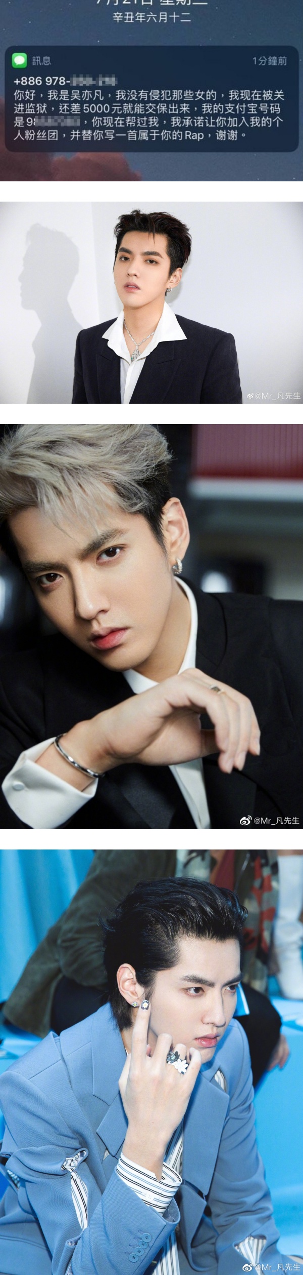 艺人吴亦凡被网红都美竹爆出“酒桌选妃”、诱骗未成年少女等各种黑料,这几天下来让网友吃瓜吃饱吃满。没想到,有网友竟然收到了吴亦凡的求救信息,对方要求借5000元以交保。