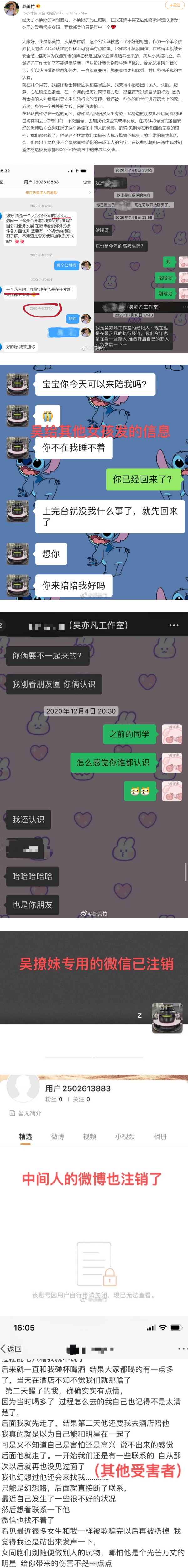 在我认真和你在一起的同时,你和我周围很多女生有染,我身边的朋友也是以同样的理由被你叫去…你专门有一个微信号,去加我们这些未成年女孩,在我6月3号发完各自安好的微博后你立刻注销了这个微信和中间人的微博。的确 见到你在我们面前无辜的眼神,我们都心软了,但是这不代表我们要做被人玩弄欺骗的玩具!我非常的震惊和无奈,但是出于隐私我不会暴露同样受伤的未成年人的名字,在这些视频和言语中我才知道你的选拔要求都是00后和在高考中的未成年女孩....