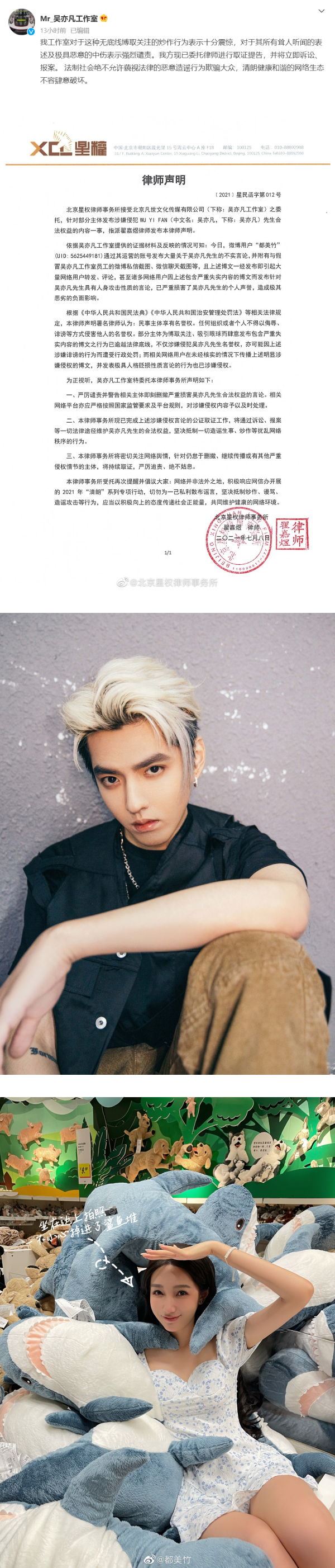 贴文曝光后,瞬间引起网友热议,吴亦凡也委托了律师事务所针对此事发声明指,都美竹发布了大量不实言论,已经严重损害吴亦凡的个人名誉,造成极其恶劣的负面影响。吴亦凡方坚决抵制一切造谣生事、炒作等扰乱网络秩序的行为。