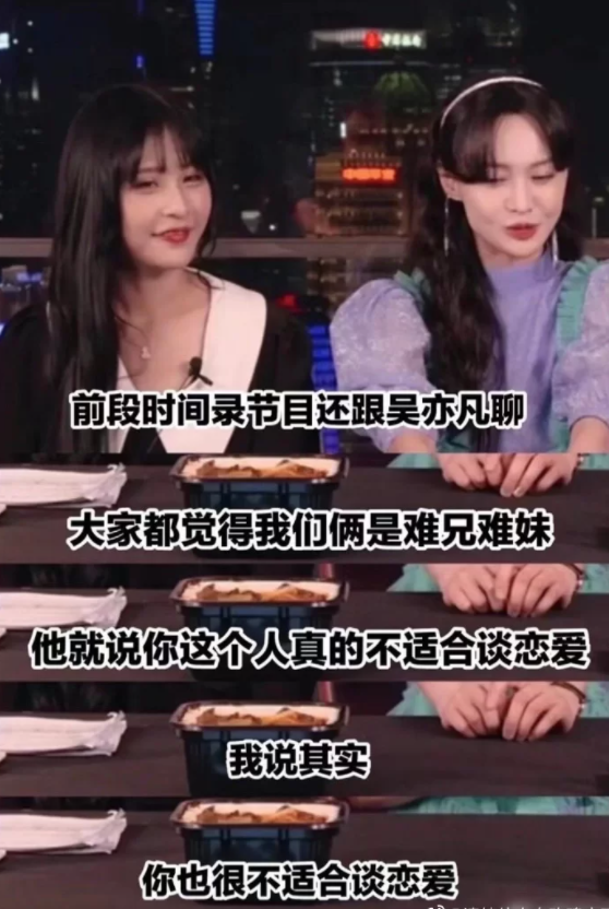 随后,郑爽提起曾和吴亦凡一起录节目,两人聊起了爱情话题:“他就说你这人不太适合谈恋爱”,她表示认同、也反驳对方,“我说其实你也不是很适合谈恋爱”;两人还有“难兄难妹”之称。