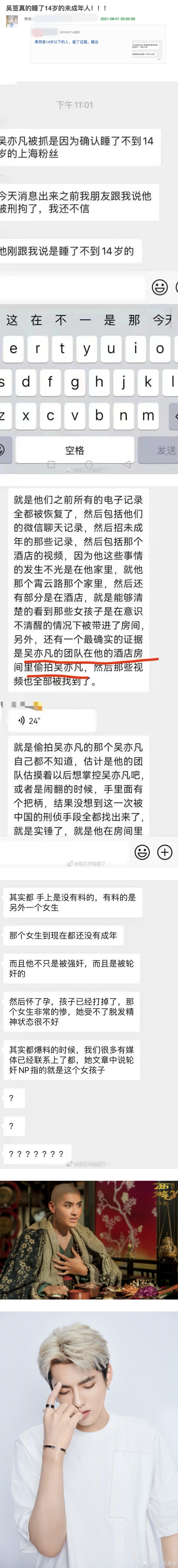 爆料者以“吴签真的睡了14岁的未成年人”为题,表示在刑拘的消息出来之前,就接到吴亦凡因为被确认与14岁的上海女粉丝而遭到逮捕的消息。据悉,警方还原了所有的聊天记录,发现了在吴亦凡家中和酒店的“偷拍”视频。