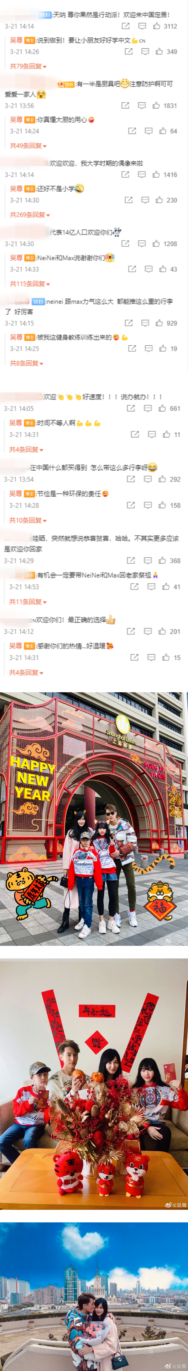 吴尊曾提及计划让儿女到中国上学及学习中文,也替孩子物色了学校。中国网友大赞吴尊行动迅速,“天呐 尊你果然是行动派”、“代表14亿人口欢迎你们”、“好速度!!!说办就办!!!”,也有人被行李箱的数量震撼:“在中国什么都买得到,怎么带这么多行李呀”,吴尊则回复,“节俭是一种环保的责任”。