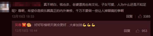 没想到,吴尊竟然亲自回复这则留言:“好好珍惜明天就会更好...大家加油。”实际上,底下还有不少类似的留言像是“你千万不能出轨啊”、“吴尊是我最后的倔强,不要翻车”,都希望吴尊不要塌房。