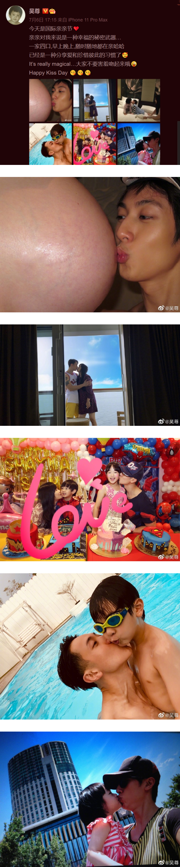 6日午间,吴尊在微博上发放了一系列的亲吻照,他在贴文中提到当天是国际亲亲节,“亲亲对我来说是一种幸福的秘密武器”;吴尊搞笑地说,一家四口随时随地都在亲亲,这已经是家人分享爱和珍惜彼此的习惯。文末,吴尊不忘鼓励大家大家不要害羞吻起来,“Happy Kiss Day”。