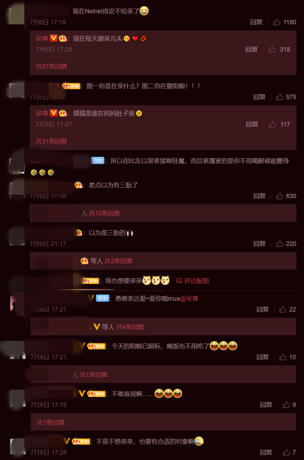 曝光照片除了看到吴尊亲吻林丽吟的孕肚之外,他也大方分享夫妻之间的亲嘴照,和子女各人的亲亲照。网友看了之后直呼,“差点以为有三胎了”、“以为是三胎的”、“不敢直视啊”、“今天的狗粮已超标,晚饭也不用吃了”等。
