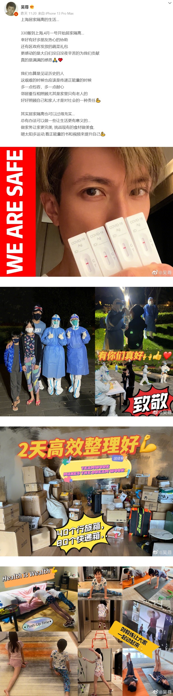 10日上午,吴尊在微博上写下居家隔离的状况,他提到所幸有好友和区政府的帮助提供蔬菜礼包,他也特别感谢大白们(防疫人员)日以继夜的为人民付出,还晒出一家四口自我检测呈阴性的照片。