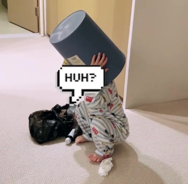 奚梦瑶日前在小红书晒出一段视频,只见一岁多的何广燊穿着条纹卡通睡衣,手上拿着一个垃圾桶往头上套,让奚梦瑶都忍不住笑问:“你干嘛呢?”