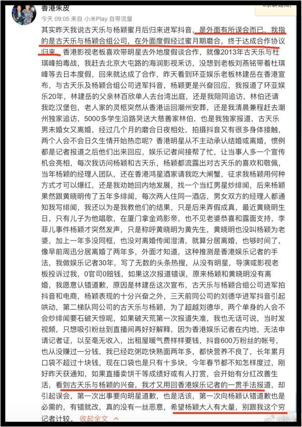 他透露自己无法在中国申请记者证导致零收入,为了赚钱才出此下策:“当时发视频,只是想吸引粉丝到直播间再好好解释。”他使用香港娱乐记者一贯的手法报道,没想到却闯祸:“第一次出事要向明星道歉,也是活该;希望杨颖大人有大量,别跟我这个穷记者计较。”