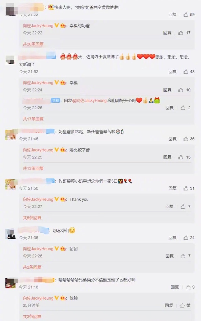 向佐时隔一个月再度发文,让粉丝激动表示:“快来人啊,失踪奶爸抽空发微博啦”,没想到却让他开心回应:“幸福的奶爸”,透露出有女万事足的好心情。当网友表示:“奶皇爸多吃点,新任爸爸辛苦啦”时,他则回复:“她(郭碧婷)比较辛苦”,表达出对老婆的爱和体贴。