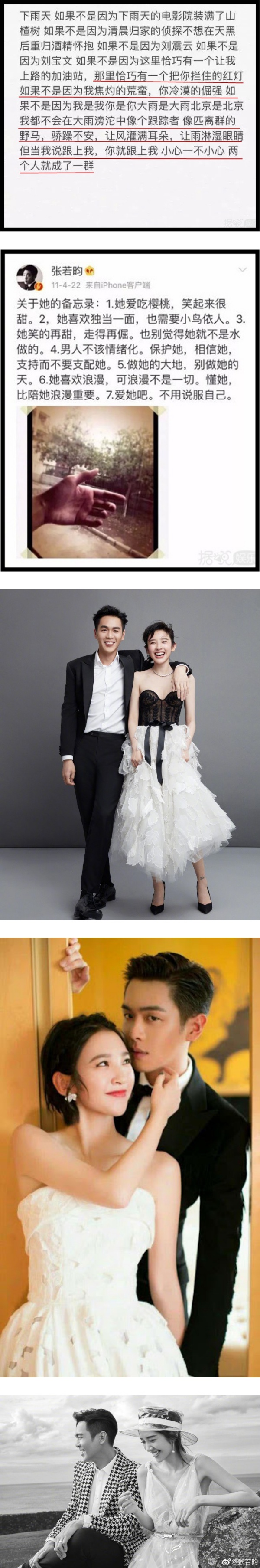 这一对情侣相遇的过程,完全就是偶像剧啊!一个下雨天,张若昀开车从加油站出来,正巧遇到等红灯的唐艺昕,两辆车摩擦到了,就这样,两人相知、相许了。虽然一直没有官宣,但两人的恋爱却成了“公开的秘密”,张若昀还会在微博写下女友的性格爱好,“爱她吧,不用说服自己”。
