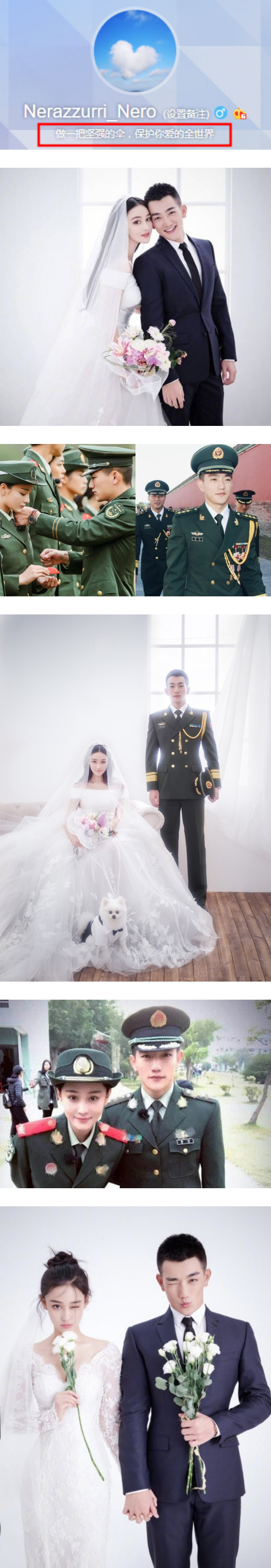 这一对是我觉得最梦幻的!而且早在他们官宣前,晋江上就有一本设定类似的小说,现役军官 VS 是非缠身的女明星的爱情故事。一个被恶意打压导致是非不断的美艳女星,在真人秀中认识了本不应有交集的军人,排除万难终于在一起,两人婚后虽然低调,但依然看得出感情坚韧,男方的微博简介更换成:“做一把坚强的伞,保护你爱的全世界”。