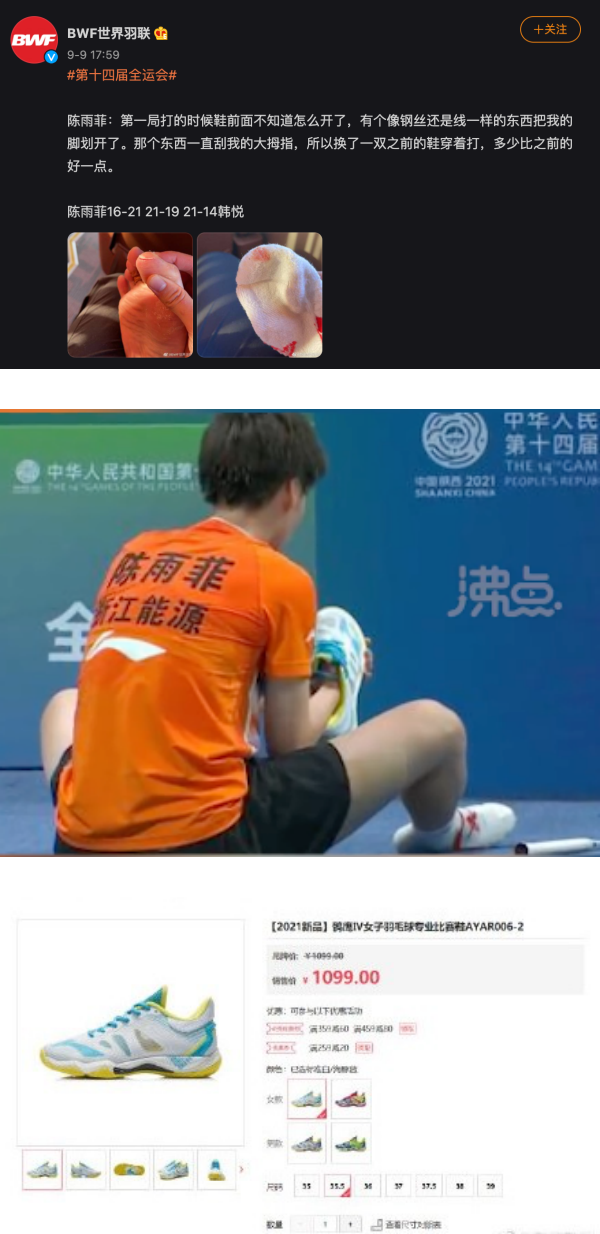 陈雨菲9日透过世界羽联的微博发文,透露自己在比赛的第一局时,脚上的鞋子因为不明原因裂开,有个像钢丝一样的东西将她的大拇指划开,脱下袜子才发现大拇指超深的割痕,并且全都是血,让她只能换双鞋才能继续比赛,而她一开始穿了出问题的球鞋也被挖出是中国品牌李宁的商品,一双要价人民币1099元(约705令吉)。