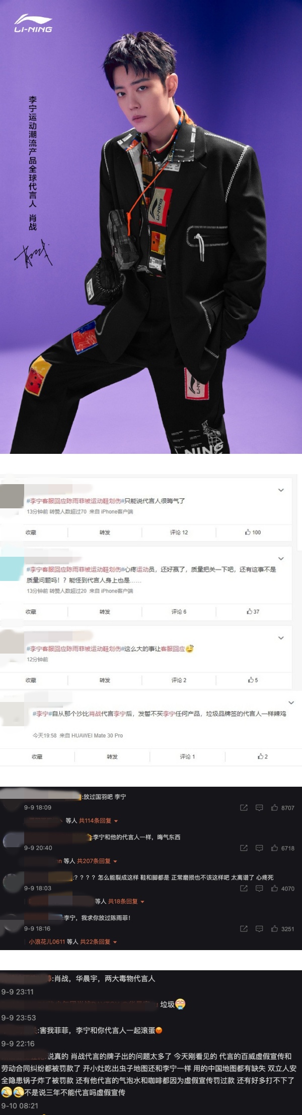 肖战无故遭受网友谩骂后,也有不少粉丝澄清他只是潮流支线的代言人,并非运动支线的代言人,且球鞋品质出事根本不应该责怪代言人,而是应该怪品牌,希望民众可以理性态度看待。