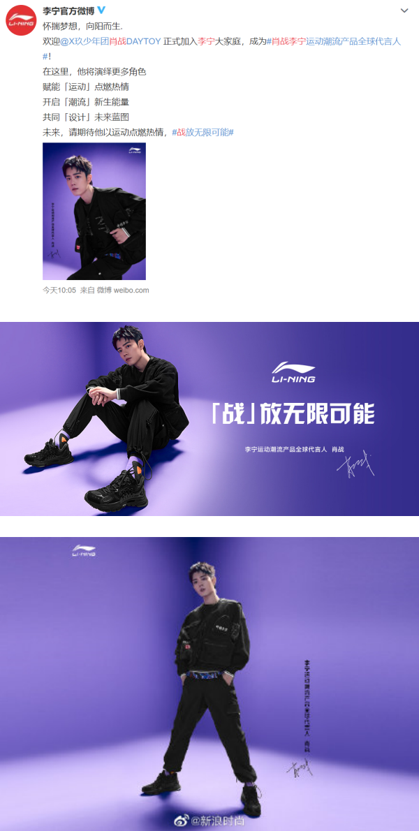 李宁官方微博发文指,“欢迎肖战正式加入李宁大家庭,成为肖战李宁运动潮流产品全球代言人!”期待肖战和李宁接下来将带来的各种可能和惊喜。