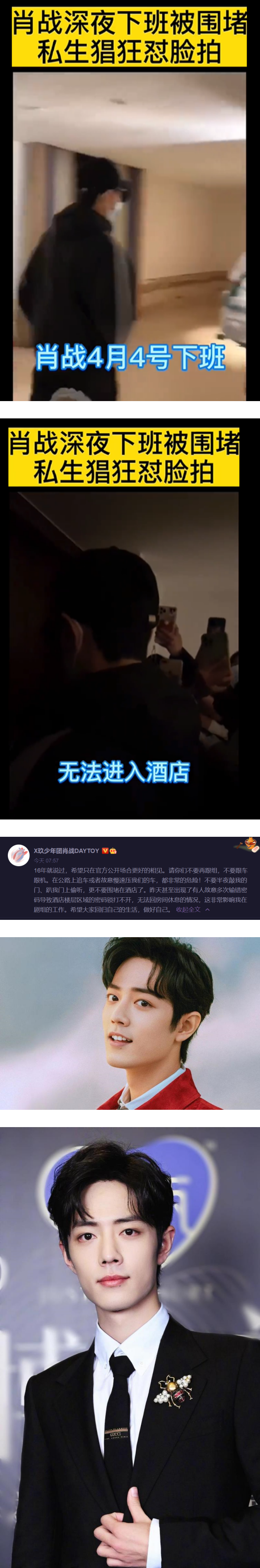 同时,肖战也再次提醒粉丝,不要再到酒店骚扰,就在昨天(4日)有者故意多次输入错误密码,导致酒店楼层区域的密码锁打不开,无法回房休息。他狠批,这种行为已经严重影响自己和剧组的工作,“希望大家回归自己的生活,做好自己。”