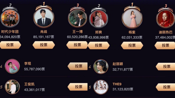 杨紫则获得6239多万票数,和肖战的成绩十分接近。值得一提的是,这是两位连续两年霸榜,今年可能会再次同台领奖!