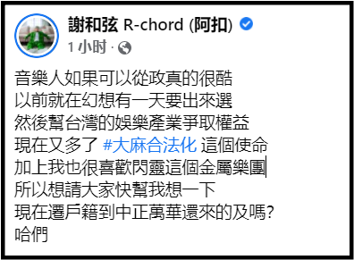 谢和弦今天(5日)突然在FB发文,表示:“音乐人如果可以从政真的很酷,以前就在幻想有一天要出来选。”而他除了希望能帮音乐产业争取权益外,还想要努力争取大麻合法化,认为这是自己的使命。